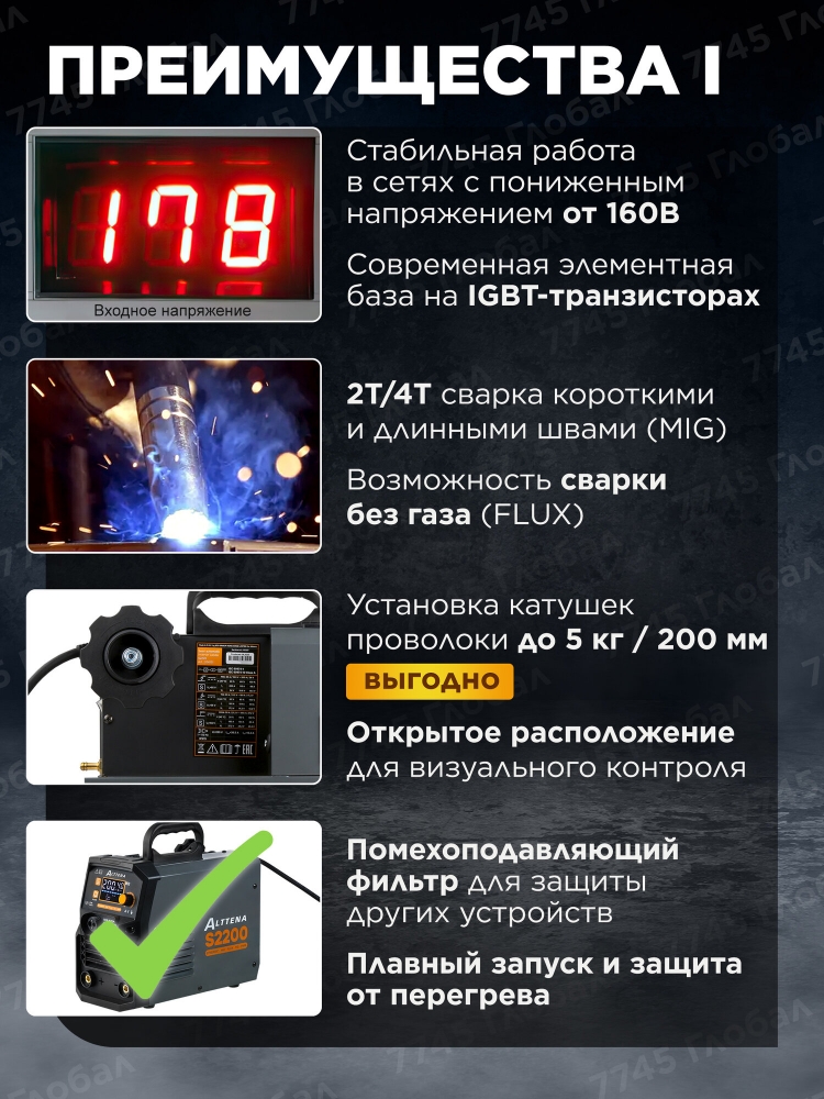 Сварочный полуавтомат ALTTENA S2200 с газом и без газа, mig-mag, flux, mma, tig