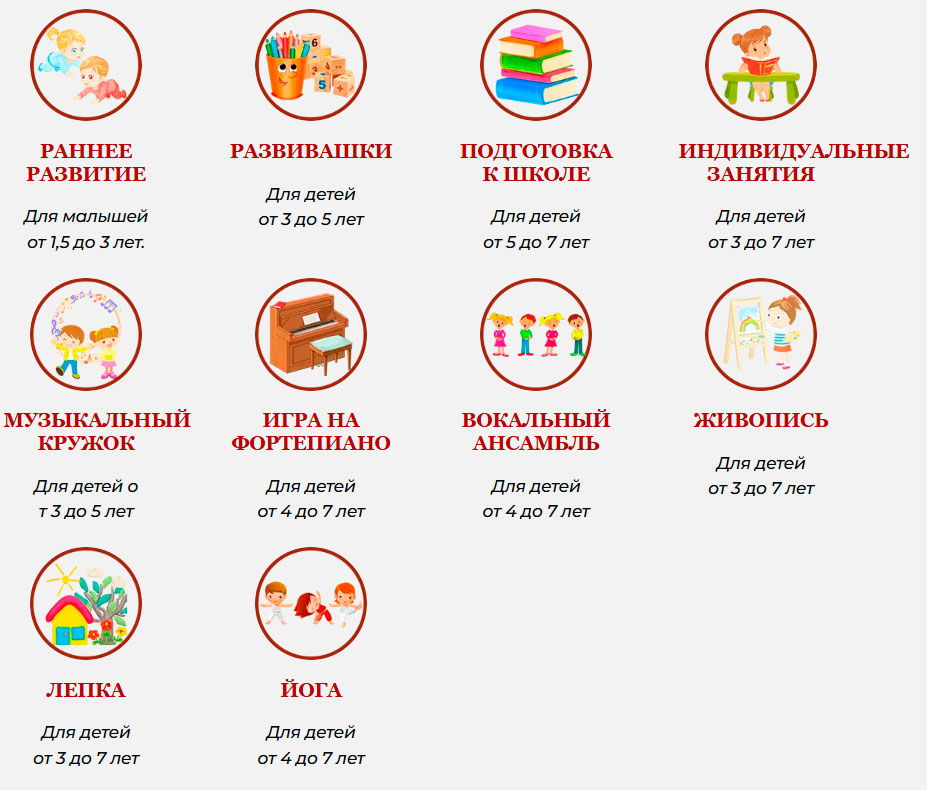 1. Раннее развитие (для детей 1-3 лет)Занятия «Мама и малыш» направлены на сенсорное развитие, мелкую моторику, речь и адаптацию в коллективе через пальчиковые игры, лепку, музыку и творческие задания. Занятия проходят в присутствии родителей.