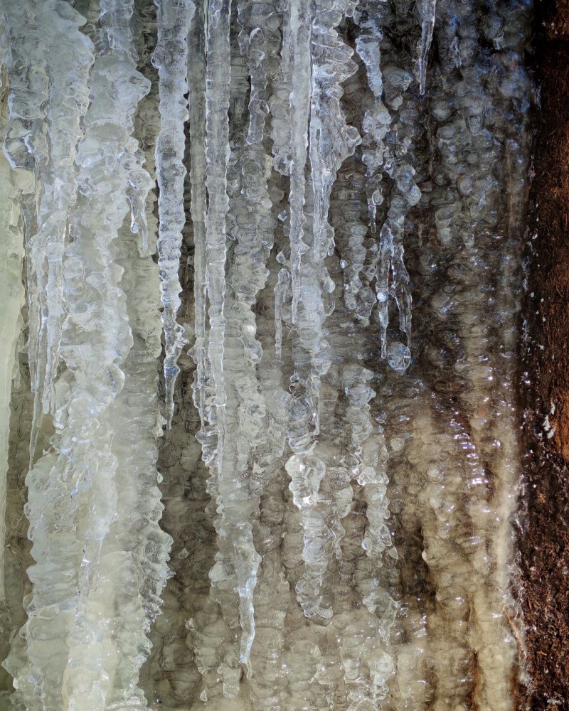 Каждый ярус этого водопада превратился в каскад льда, местами кристально-прозрачного, местами молочно-белого, а кое-где даже с такими янтарными оттенками, словно внутри застыл солнечный свет. ☀️ Ты видишь эти сосульки, которые свисают, как гигантские сталактиты? А эти нагромождения льда, похожие на белоснежные облака, застывшие прямо на коричневых скалах? Это такой контраст – теплая, землистая порода и холодное, сияющее льдом волшебство! ✨