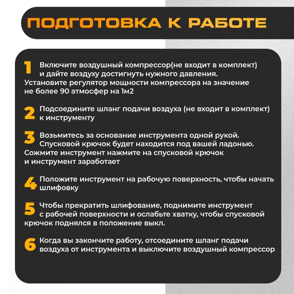 Хватит мучиться с наждачкой и тратить часы на шлифовку! Пришло время модернизировать свой подход к работе. Включи компрессор, возьми в руки эту чудо-машину и почувствуй разницу. Ты увидишь, как твои проекты будут приобретать профессиональный вид, а сам процесс работы станет приносить гораздо больше удовольствия. Твой новый лучший друг в мастерской ждет тебя – не заставляй его скучать! Вперед, к гладким поверхностям и идеальным результатам! 🚀✨