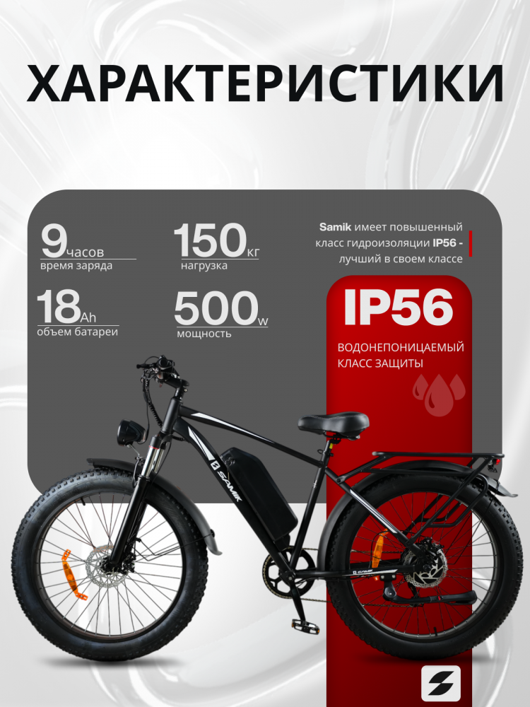 Электровелосипед SAMIK "V3 Max", черный, 45км/ч, мощность 240Вт, вес 36,1кг, АКБ 18Ah