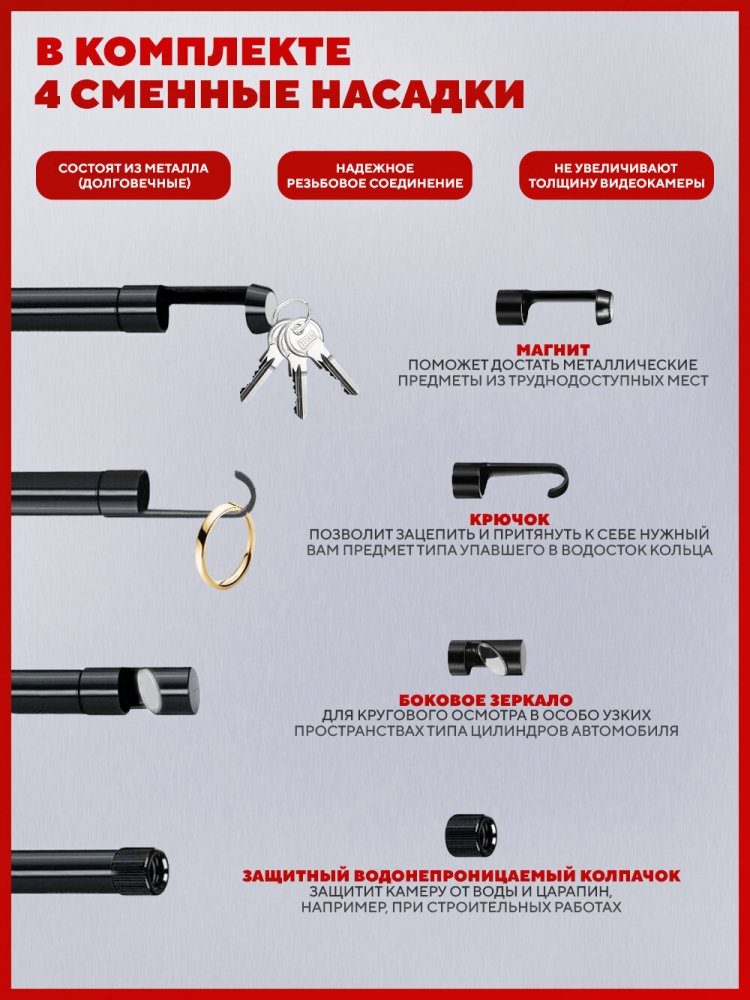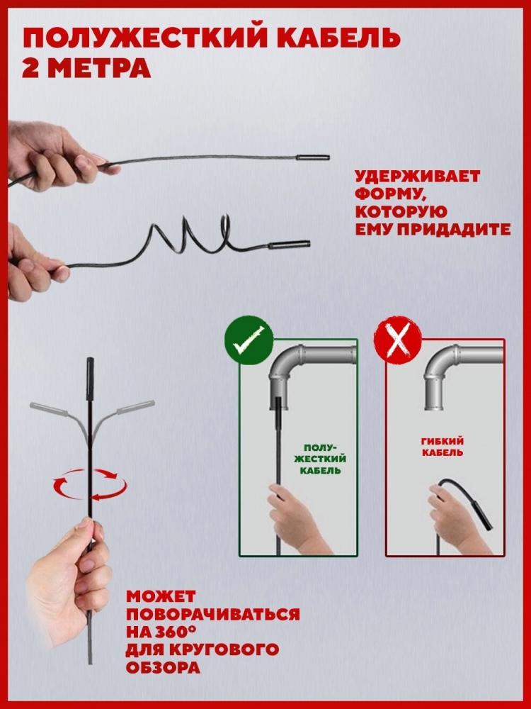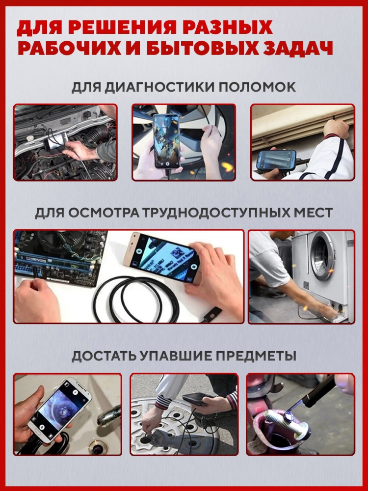 Мини-глаз в Труднодоступных Местах: По сути, это такой гибкий "щуп" с крошечной видеокамерой на конце. Камера передает изображение на ваш смартфон (или планшет/ноутбук), позволяя вам увидеть то, что скрыто от глаз.