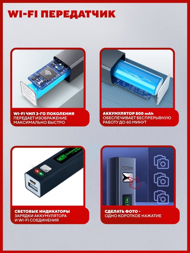 Без Интернета – Надежно! Это большой плюс. Вам не нужно переживать за наличие Wi-Fi сети или мобильного интернета. Эндоскоп сам создает свою сеть, где бы вы ни находились.
