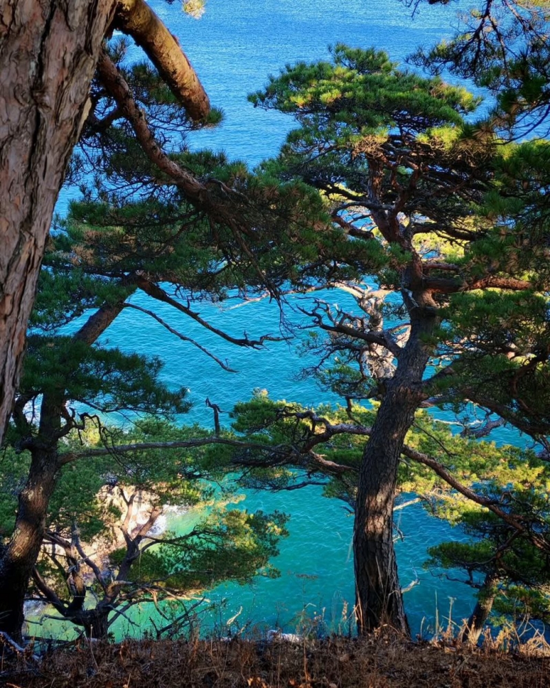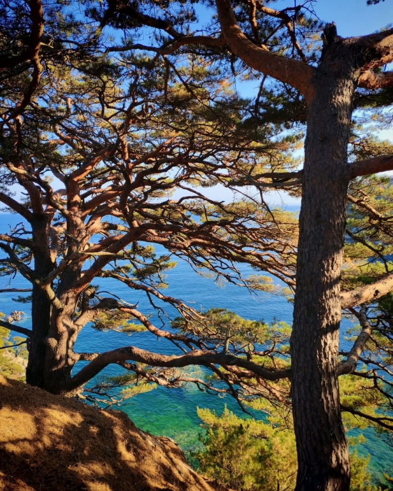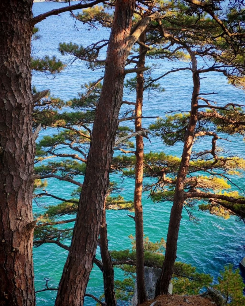 Сосны, бросающие вызов: Посмотри на деревья на фотографиях! Они не просто растут, они живут на этих скалах. Их стволы причудливо изогнуты, ветви тянутся к морю, словно пытаясь его обнять. Кажется, что они цепляются за жизнь изо всех сил, и это зрелище вызывает огромное уважение. Это такие "сосны-акробаты", настоящие йоги среди деревьев, умеющие гнуться, но не ломаться под ветрами.