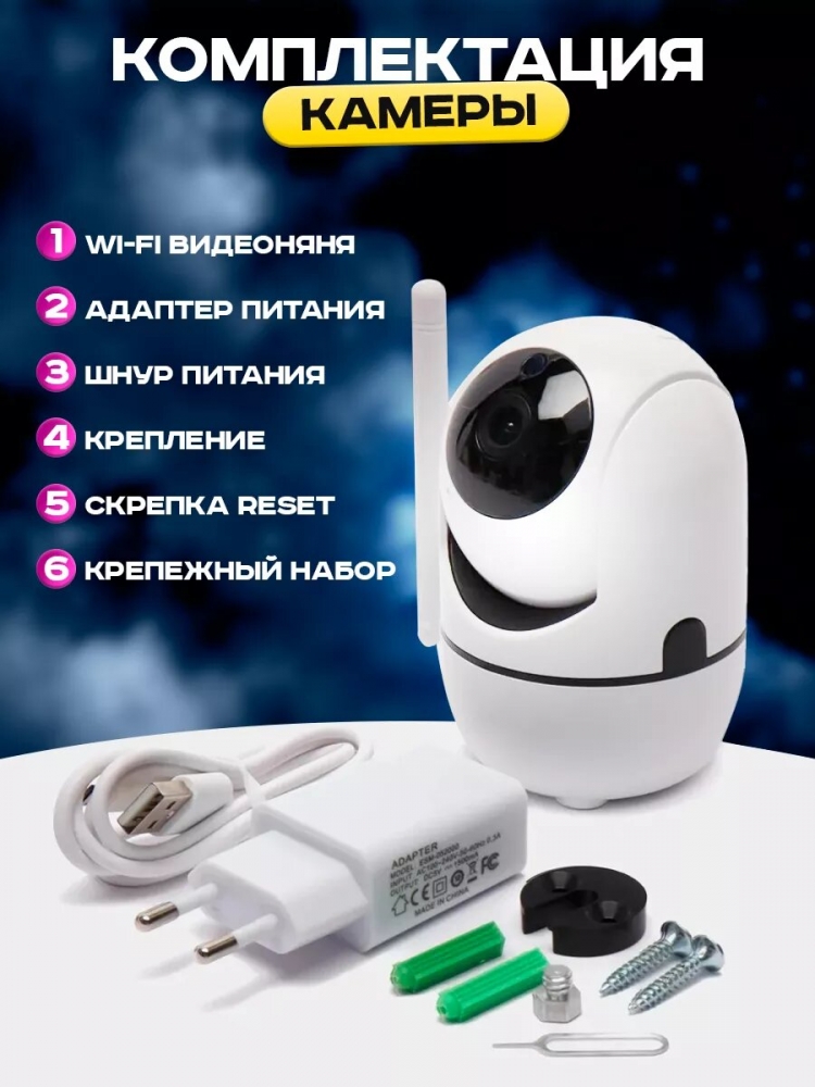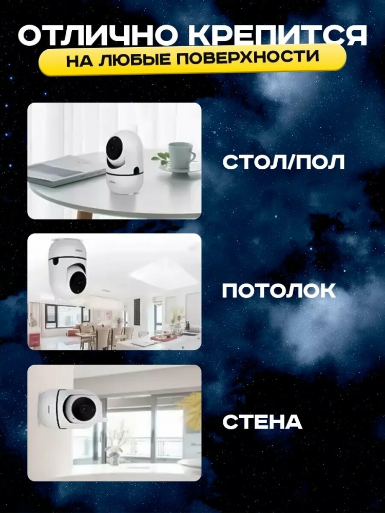 Универсальные крепления: В комплекте идут крепления, которые позволяют установить камеру где угодно: на полке, на стене, на потолке.