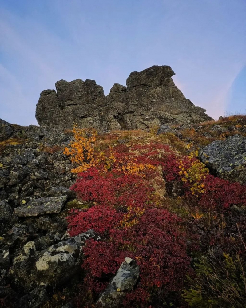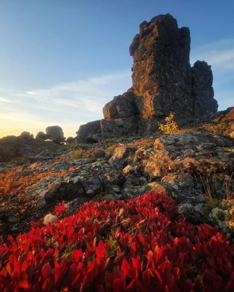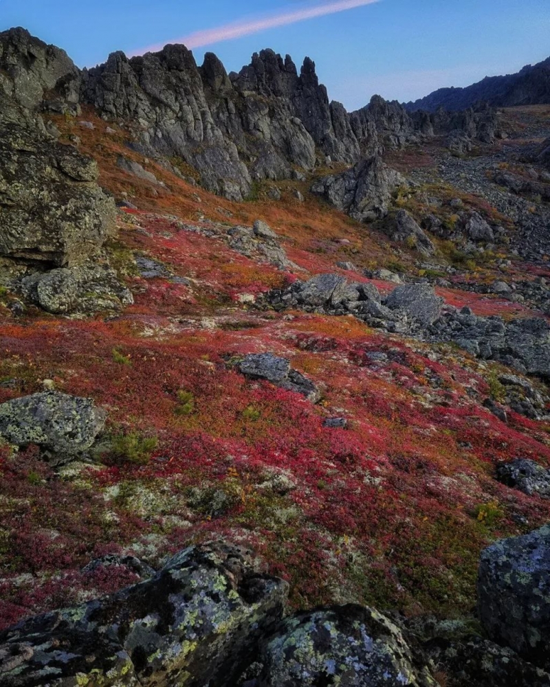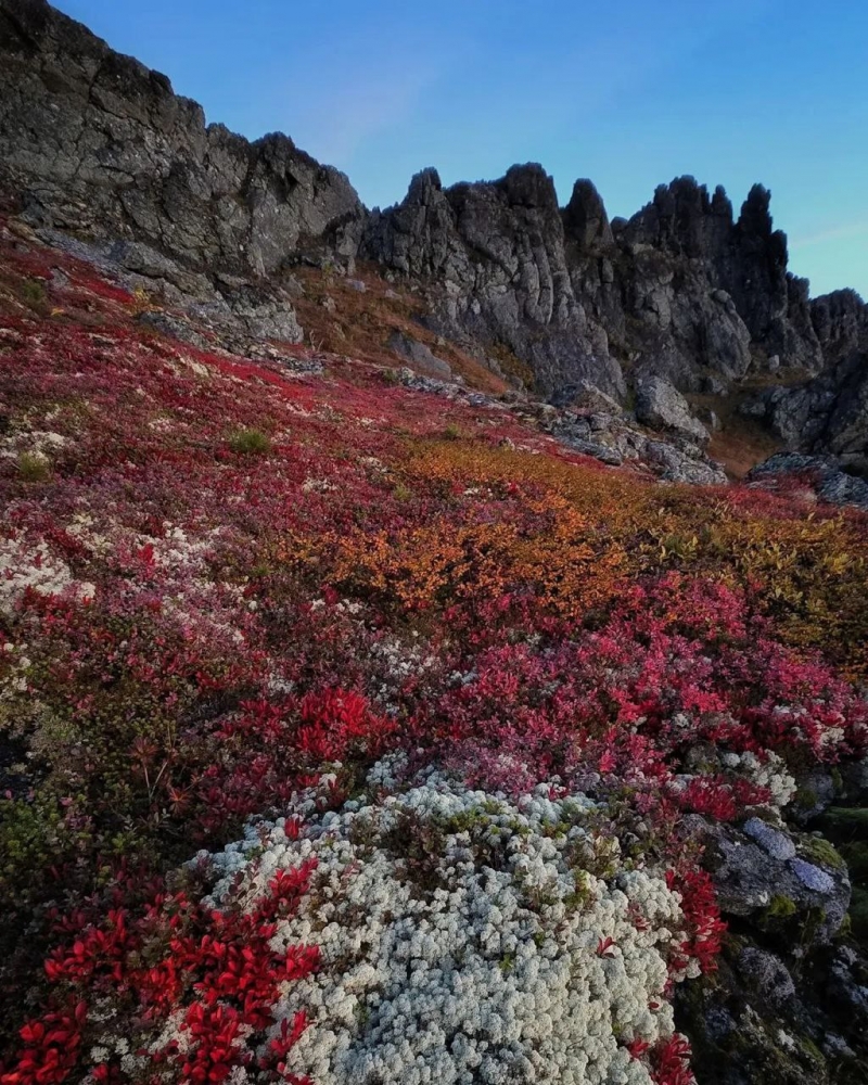 Красный ковер! Серьёзно, это не просто отдельные кустики. Это целые поляны, устланные ярко-красными растениями. Очень похоже на бруснику или чернику, которые на Урале осенью приобретают именно такой огненный оттенок. Это создает фантастический контраст с серыми камнями и золотыми лиственницами.