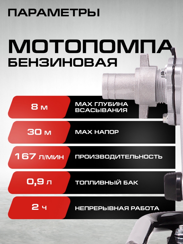 Высота всасывания – до 8 метров, подъёма воды целых 30 метров! Для тех, кто не в курсе – это серьёзные показатели. Если у тебя затопило погреб или подвал, мотопомпа без проблем откачает воду. Собираешься поливать грядки с колодца или пруда? Тоже без проблем, мощный напор обеспечен.