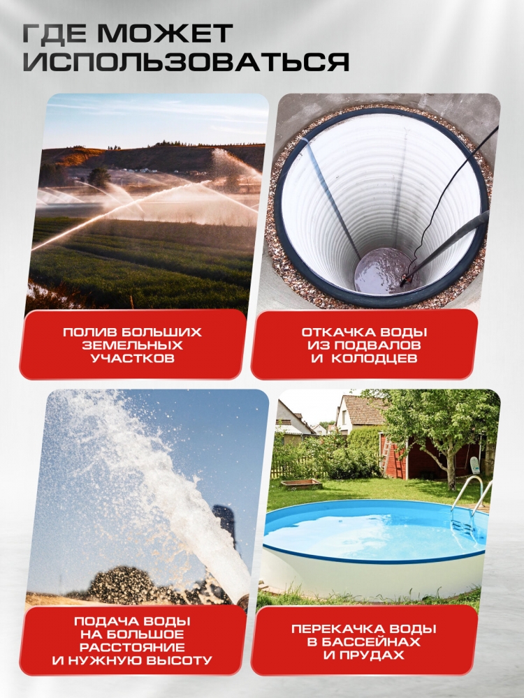Пожаротушение: Мощный насос – это настоящая подмога в критических ситуациях, когда срочно нужно быстро подать воду.