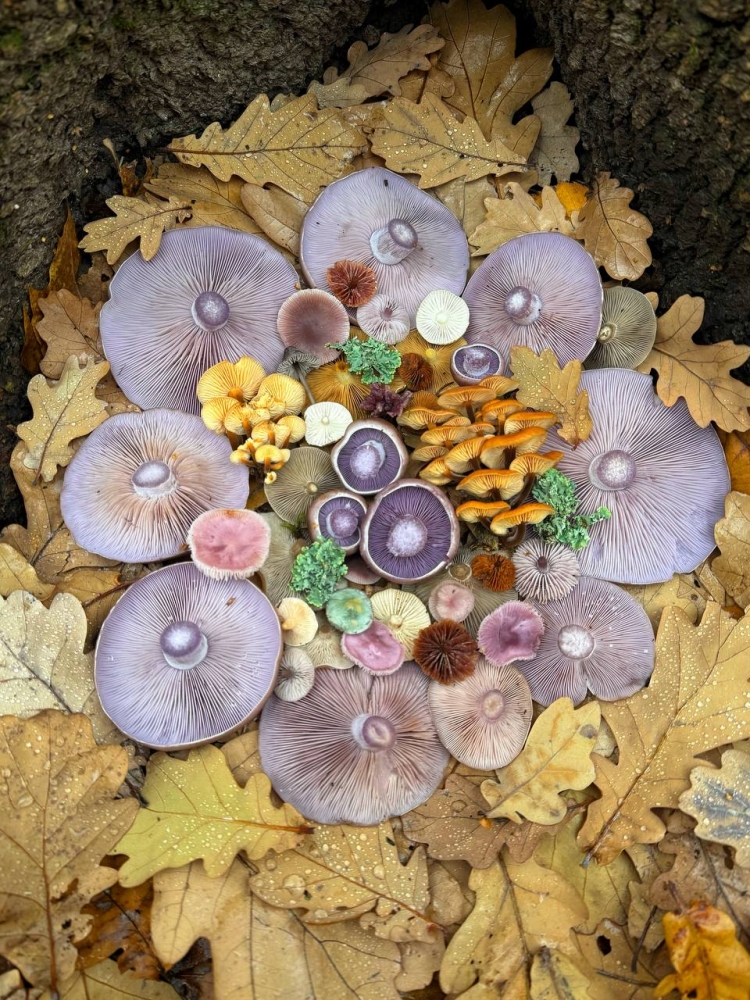 Ну, вы только посмотрите на эту грибную композицию! 😍 Это же не просто грибы, это целая мандала, созданная самой природой (ну, или очень талантливым человеком, который нашёл эти дары леса). Фиолетовые, жёлтые, оранжевые, коричневые – какие только оттенки не собрались в этом лесном венке! А вокруг – золотистые дубовые листья, как будто рамка для шедевра.