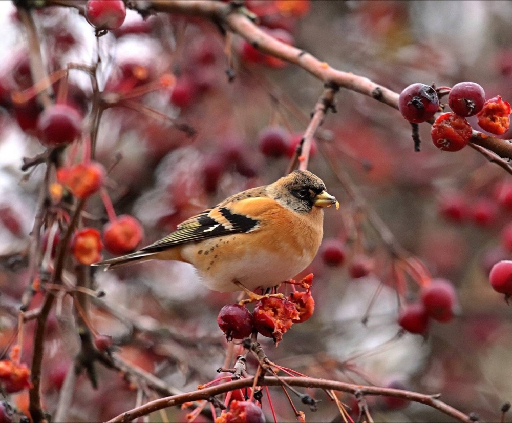 И вот он, ещё один привет из уходящей осени, но уже с намёком на зиму – яркий зяблик (или вьюрок), который уплетает ягоды рябины! 😋 Его оранжево-коричневое оперение так контрастирует с красными ягодами и голыми ветками. Это как маленький огонёк в уже довольно прохладном мире.