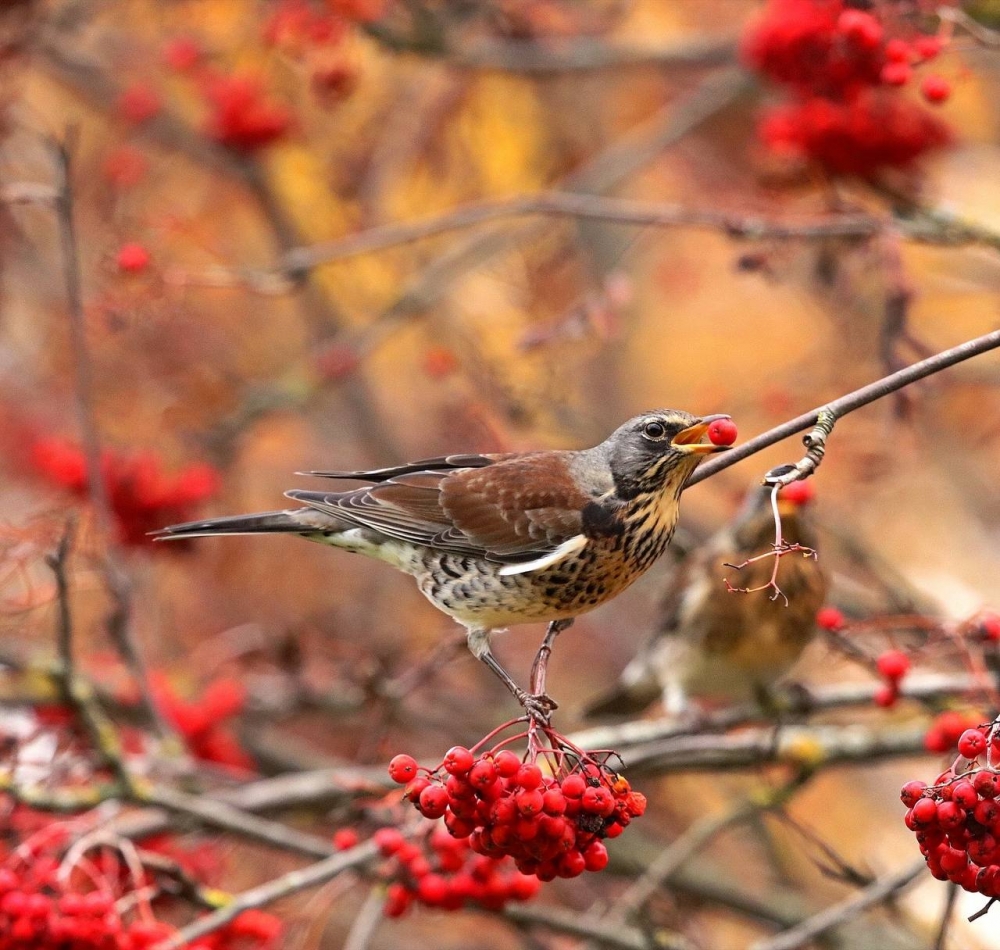 Командная работа: Дрозды-рябинники – птицы социальные. Они редко летают в одиночку, предпочитая собираться в целые стаи. И когда такая стая садится на рябиновое дерево, кажется, что ветки сейчас просто рухнут от количества пернатых обжор! 🤯