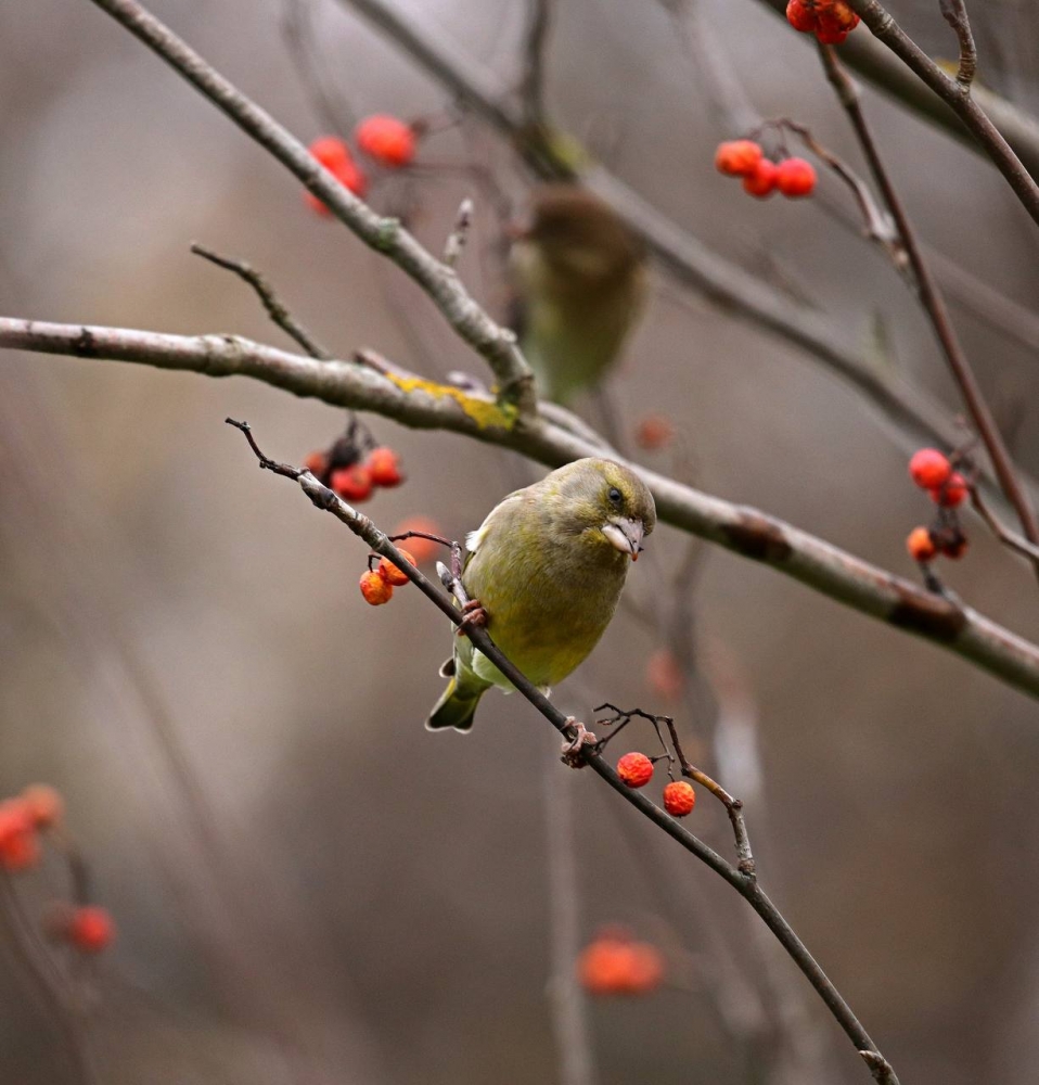 Они, в отличие от дроздов, не налетают шумной толпой. Зеленушки предпочитают более уединенные трапезы.