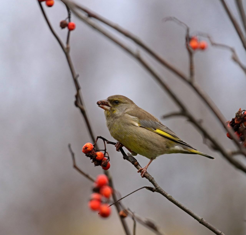Природная маскировка: Благодаря своему оливковому оперению, зеленушка прекрасно маскируется среди веток и листьев (или, как на фото, среди голых веток и ягод). Она не такая броская, как сойка, но ее нежный окрас – это просто чудо. Она как маленький, но очень стильный акцент в осеннем дизайне природы. 🌿