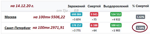 Посмотрим на эпидситуацию в городе в сравнении с Россией и Москвой. Показатель на 100 тысяч населения по РФ на текущий момент составляет 1827,11, в Москве - 5506,22, в СПб - 2971,91. То есть средний показатель по стране показатель в Санкт-Петербурге превышает на 62,66 процентов.