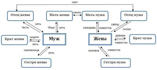 Разобраться с родственными связями можно изучив подобную таблицу. Тут и брат жены, и сестра мужа, и золовки с шуринами.
