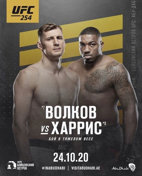 В ближайшую субботу, 24 октября, "Бойцовский остров" в Абу-Даби примет ивент UFC 254. Помимо прочих боев в главном карде запланировано проведение поединка российского тяжеловеса Саши Волкова против американского оппонента Уолта Харриса. Судя по расписанию бой будет третьим с конца, то есть начнется в районе 23.00 по московскому времени. Но это в том случае, если не слетит какой-либо поединок перед ними. Оно понятно, что организаторы постараются вывести начало всех боев на нужный график, но от накладок никто не застрахован. Но в любой случае, противостояние Волков - Харрис будет показано на телеканалах "UFC ТВ" и "Рен ТВ". И если "РЕН" начнет репортаж из ОАЭ с 22.30 по московскому времени, то UFC-ТВ покажет весь турнир в полном объеме с ранних прилимов в 17.30.