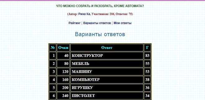 Конструктор - 40 баллов за ответ; Мебель - 80 баллов за ответ; Машина - 120 баллов за ответ; Компьютер - 160 баллов за ответ; Игрушка - 200 баллов за ответ; Пистолет - 240 баллов за ответ.Кроме автомата Калашникова, можно ещё разобрать и собрать ручной пулемёт Калашникова.