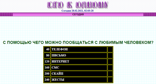 Телефон. Ответ приносит 40 баллов. Письмо. Ответ дает игрокам 80 баллов. Интернет. Этот ответ набирает сто двадцать баллов. СМС. Ответ зарабатывает 160 баллов. Скайп. За такой ответ можно получить 200 баллов. Жесты. Этот последний ответ приносит игрокам 240 баллов.100 к 1. С помощью чего можно пообщаться с любимым человеком?