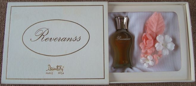 Ещё в перестройку -уже совсем близко к 90-м мне полюбились духи от "Дзинтарс" "Реверанс". У них было красивое оформление - коробка раздвигалась как спичечный коробок, была внутри устлана белым атласом и к каждому флакону в эту коробку вложена бутоньерка - цветочная искусственная веточка. У меня было три флакона - и все бутоньерки были разные, одну я носила как брошку к одежде, другие подарила приятельницам. "Реверанс" выпускается и сейчас , но абсолютно не похож запах, ничего общего. В своих советских ещё выпусках это был нежный цветочный аромат с преобладанием ноты душистого горошка, сейчас - невнятный мускусный.