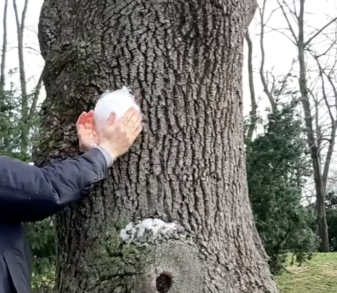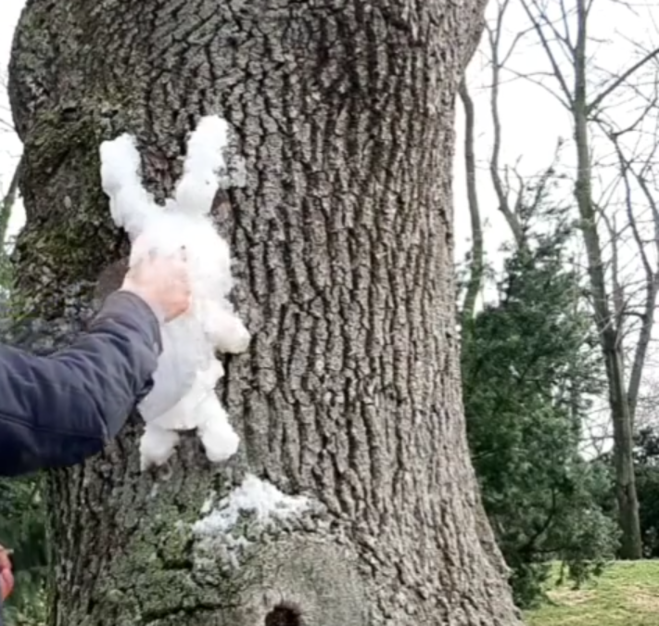 Слепить, а точнее вылепить зайца из снега на стволе большого, ну или не очень большого дерева, а также же на любой поверхности, будь то стена или кирпичная кладка, не так уж и сложно, при наличии снега. Желательно чтобы снежок был "липкий", если можно так выразиться, а не сухой и рассыпчатый. Это как при игре в снежки. Бывают дни, когда шарики из снега просто не лепятся, а рассыпаются прямо в руках. Так и здесь, если снег будет рассыпчатый, то и к поверхности он вряд-ли прилипнет.