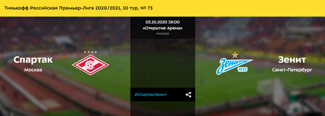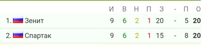 Ещё один интереснейший матч в чемпионате России по футболу состоится в субботу 3 октября 2020 года. Столичный клуб Спартак, на своей арене примет чемпиона прошлого чемпионата команду Зенит. Это игра десятого тура, именно по окончании этого тура сборная России сыграет свои очередные матчи в лиге Наций. На данный момент это видно внизу на картинке команды идут в лидерах чемпионата, имея в своем активе по 20 очков, и лиш по разнице забитых мячей, Зенит стоит выше москвичей.
