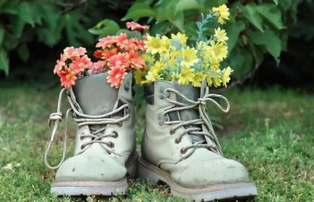Очень смешные кашпо можно сделать из старой обуви. Особенно если найдутся в доме ботинки большого размера.
