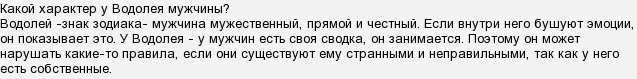 Мужчина-водолей, это обычно самовлюбленные мужчины, не любят излишней заботы,нетерпеливы,они очень умны и сообразительны,бывают вредными и изредка очень агрессивными,водолеи очень общительны, также они очень весёлые и с ними есть, о чём поговорить, приятно слушать и обсуждать проблемы, водолеи, неплохие психологи,а ещё они любят делать приятные и неожиданные сюрпризы. Про водолеев говорят, много плохого, на самом деле это прекрасный знак зодиака.