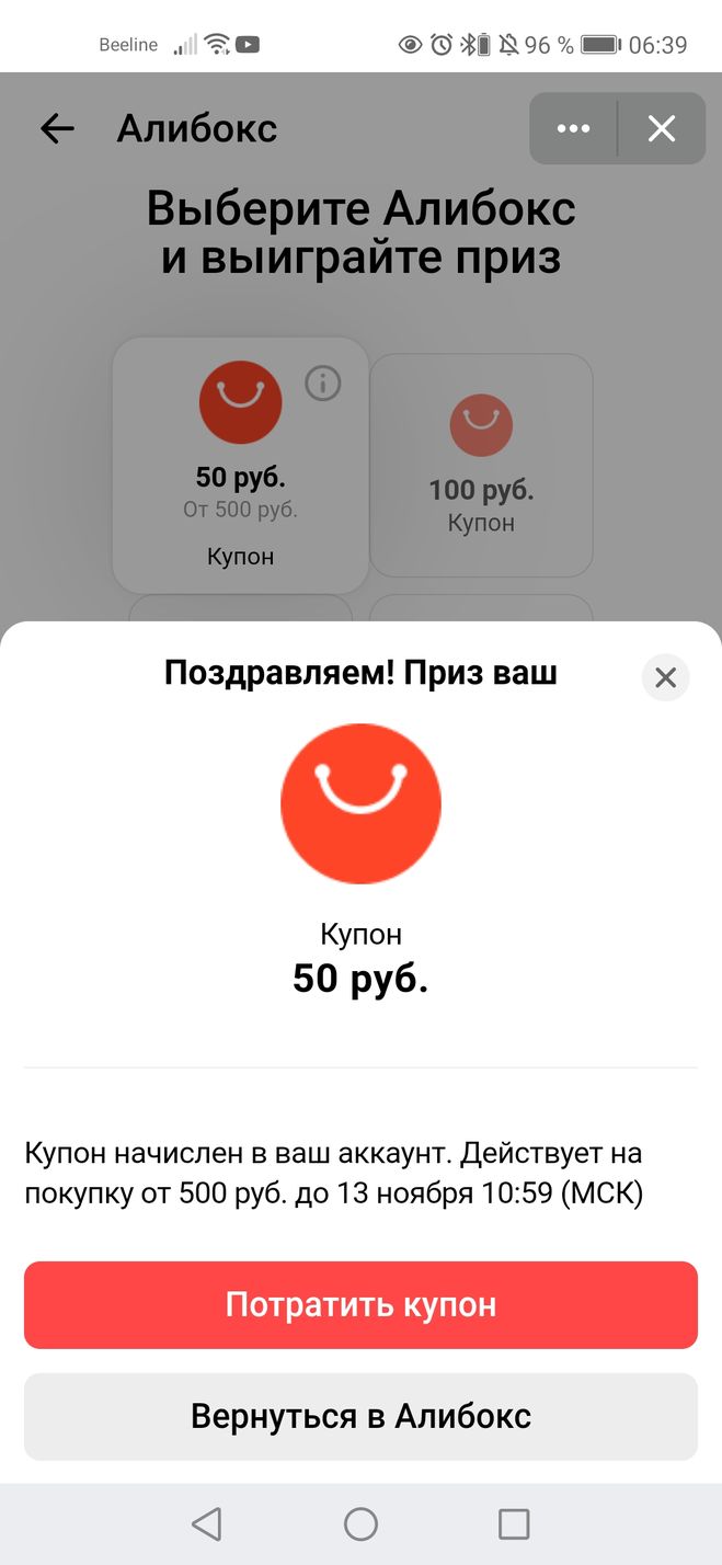 убедитесь, что у вас установлено приложение Вконтакте. Заходим в него и ищем приложение от "Алиэкспресс". Далее находим "Выиграть призы в Алибоксе", нажимаем и начинаем принимать участие в розыгрыше. У вас будет одна попытка, нажимаем на коробку, вам выпадет купон на скидку. Скидка может быть разной. Тратим купоны,совершая покупки на "Алиэкспресс".