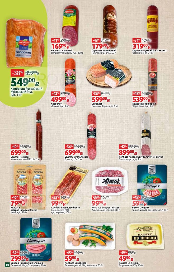 Карбонад "Российский" - 38 % скидка, сервелат "Финский" - 41 % скидка, сервелат "Московский" - 48 % скидка,