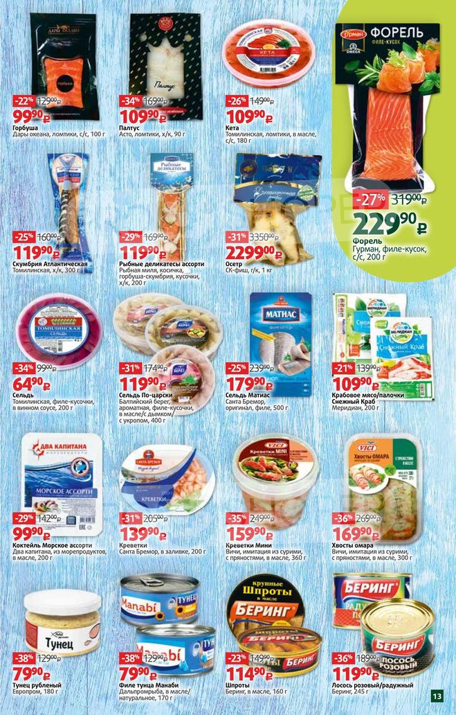 замороженные креветки - 36 % скидка, Охлажденные стейки рыбы форели 32 % скидка.