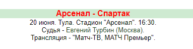 Сам матч "Арсенал - Спартак" стартует в субботу 20-ого июня на тульском стадионе "Арсенал", стартовый свисток судьи Е. Турбина (Москва) прозвучит в 16:30 мск, прямую трансляцию организуют телеканалы "Матч ТВ" И "Матч Премьер".
